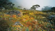 阿尔卑斯国家公园豪伊特山上雾中的野花,澳大利亚维多利亚
