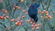 一只正在花园里吃野苹果的乌鸫,英国威尔特郡