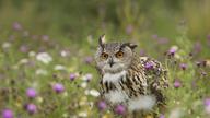 野花草甸上的一只欧亚雕鸮,德国莱茵兰-普法尔茨