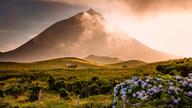 一头公牛站在皮库山前的田野中,亚速尔群岛皮科岛