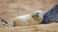 在沙滩上休息的灰海豹幼崽,英国Blakeney Point自然保护区