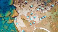 鸟瞰希腊罗德岛岩石海岸上蓝白相间的遮阳伞