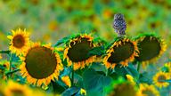 栖息在向日葵上的一只小猫头鹰,西班牙加的斯