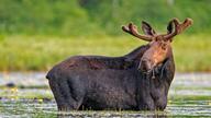 一只正在吃着百合花的驼鹿,缅因州米利诺基特