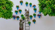 正在照看花草的孩子和祖父铜雕,西班牙科尔多瓦