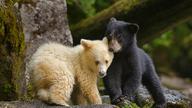 大熊雨林中一只柯莫德熊幼崽跟它的同胞挤在一起,加拿大