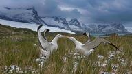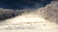 薄雾笼罩的河流中的丹顶鹤,日本北海道