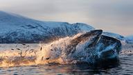 克瓦尔岛海岸以鲱鱼为食的座头鲸,北挪威特罗姆瑟