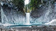 巨大的冰柱悬挂在Abiqua瀑布周围的玄武岩石墙上,俄勒冈